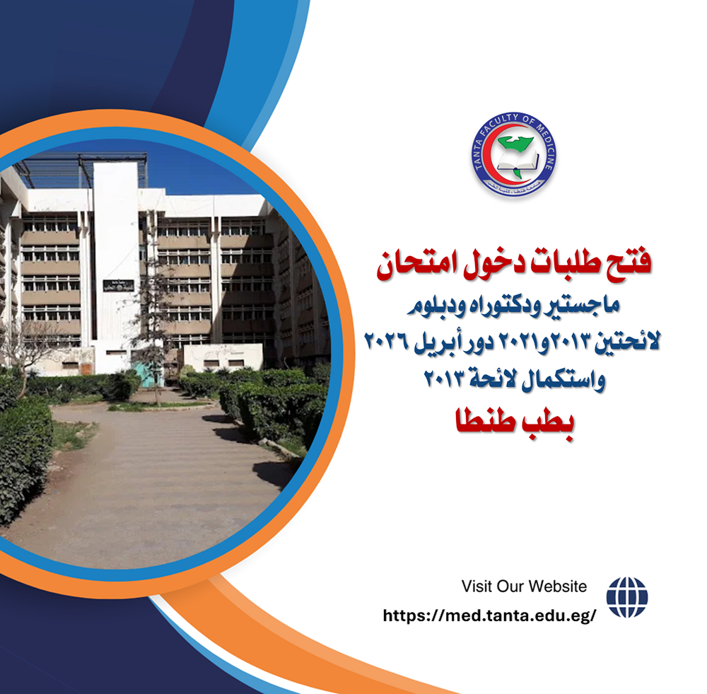 تعلن ادارة الدارسات العليا بكلية الطب جامعة طنطا فتح طلبات دخول امتحان ماجستير ودكتوراه ودبلوم لائحتين ٢٠٢١و ٢٠١٣ دور أبريل ٢٠٢٦ واستكمال لائحة ٢٠١٣