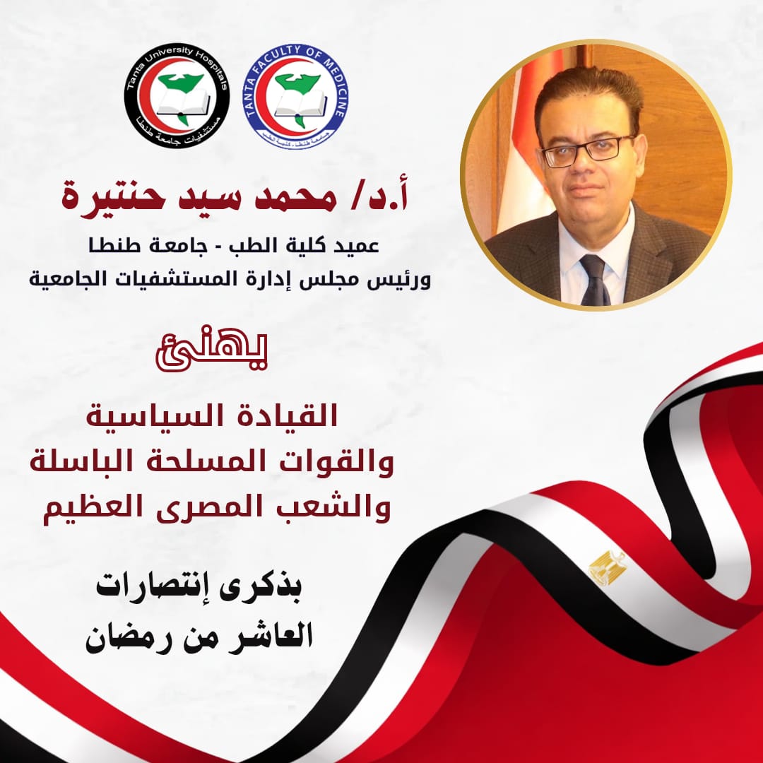 Le doyen de la faculté de médecine de l'université de Tanta adresse ses félicitations aux dirigeants politiques, aux vaillantes forces armées et au peuple égyptien à l'occasion du 10e anniversaire des victoires du Ramadan.