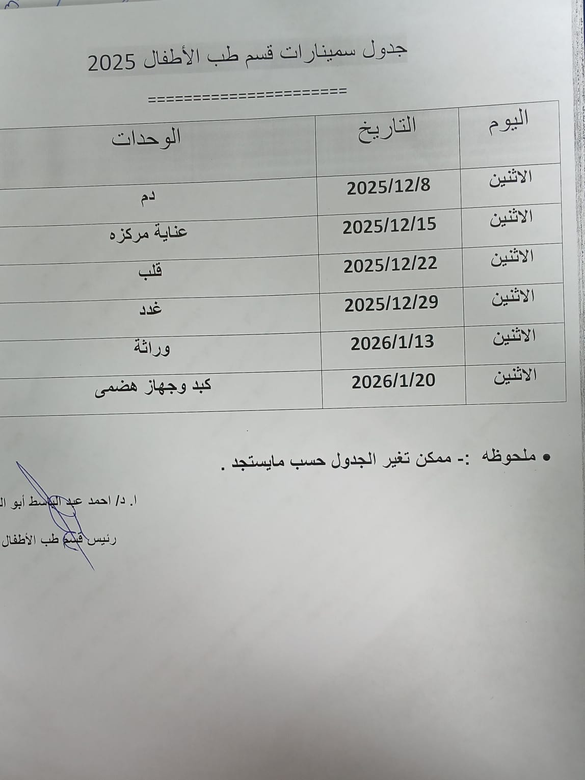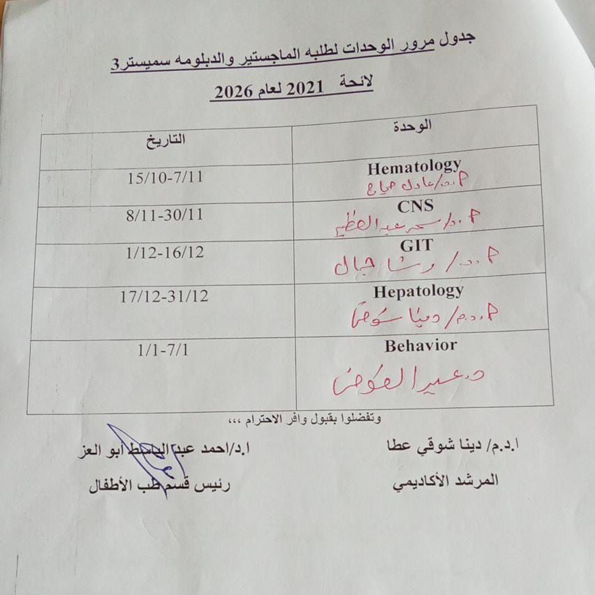 جدول اللقاء العلمى الأسبوعى لقسم طب الأطفال