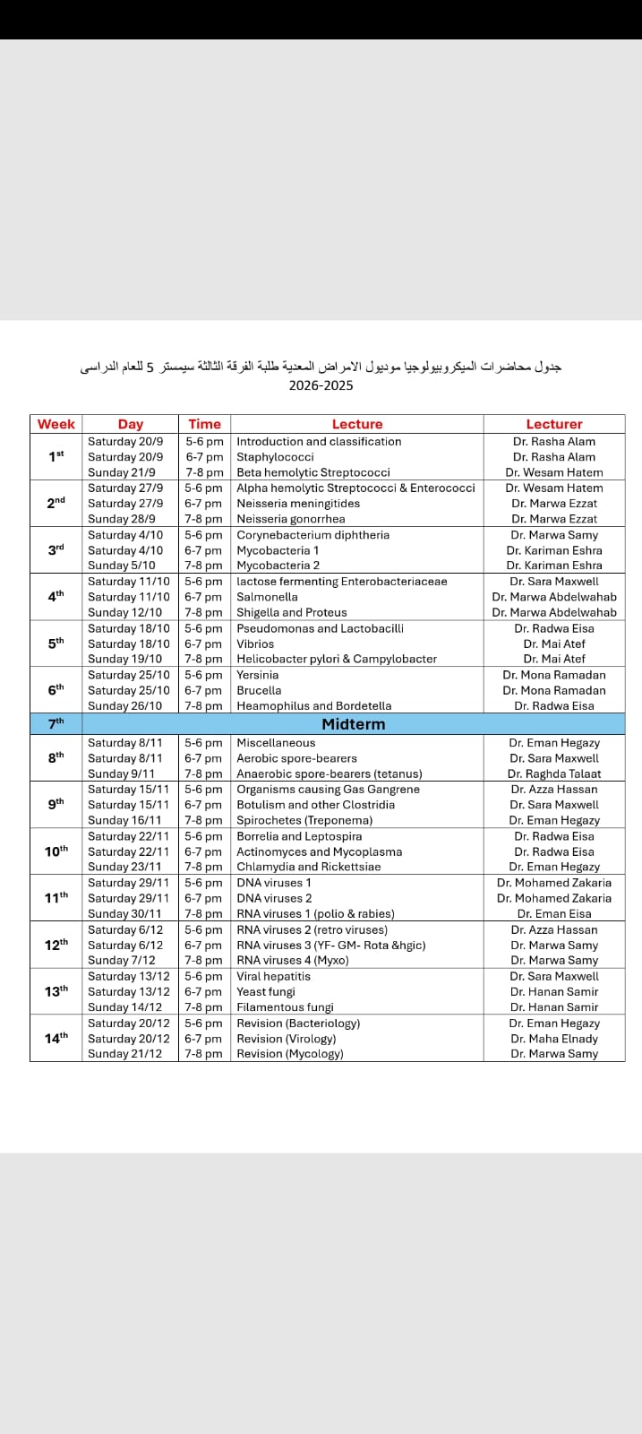 جدول محاضرات الفرقة التالتة للعام الدراسى ٢٠٢٥_٢٠٢٦.