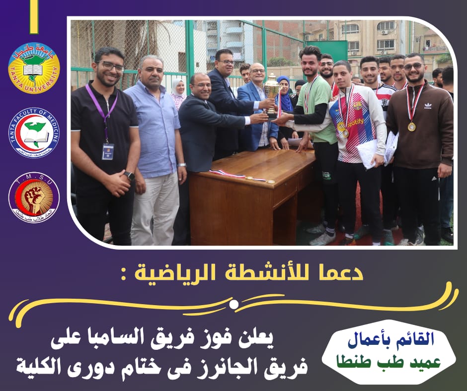 أعلن الأستاذ الدكتور محمد حنتيره القائم بأعمال عميد كلية الطب جامعـة طنطـا ورئيس مجلس إدارة المستشفيات الجامعية عن فوز فريق " السامبا " على فريق " الجانرز " فى ختام دوري كلية الطب جامعـة طنطـا المقام بالملعب الخماسي بالمجمع الطبي خلال الفترة من ١٨ أكتوبر إلى ٣ نوفمبر ٢٠٢٥ بإجمالي عدد ٣٨ مباراة تحت رعاية الأستاذ الدكتور محمد حسين محمود رئيس جامعـة طنطا والأستاذ الدكتور محمد حنتيره القائم بأعمال عميد كلية الطب جامعـة طنطـا ورئيس مجلس إدارة المستشفيات الجامعية