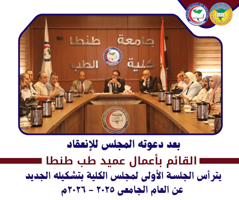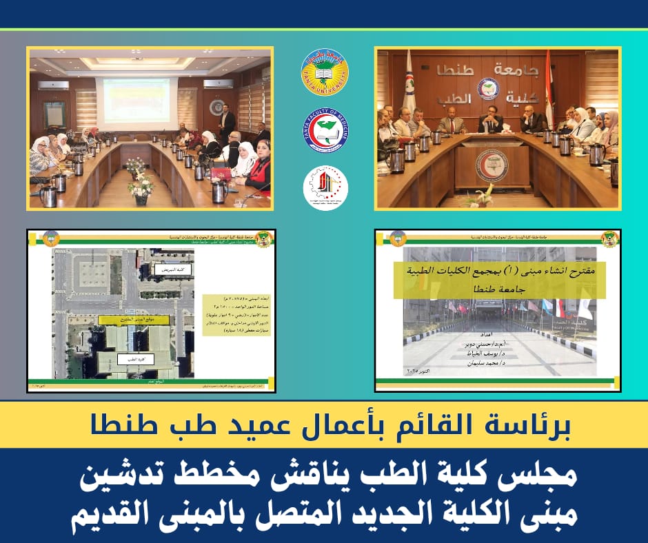 ناقش مجلس كلية الطب - جامعـة طنطـا بجلسته المنعقدة يوم الأحد الموافق ١٩ أكتوبر ٢٠٢٥ م برئاسة الأستاذ الدكتور محمد حنتيره القائم بأعمال عميد الكلية ورئيس مجلس إدارة المستشفيات الجامعية مخطط تدشين مبنى الكلية الجديد المتصل بالمبنى القديم وذلك بحضور الأستاذ الدكتور