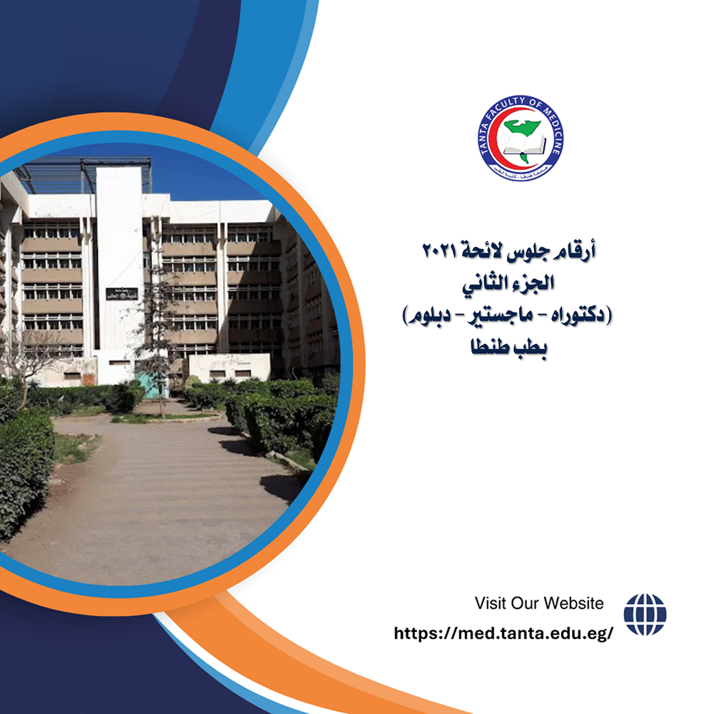 تعلن كلية الطب جامعة طنطا أرقام جلوس لائحة ٢٠٢١ الجزء الثاني (دكتوراه _ ماجستير _ دبلوم)، مع أطيب الأمنيات لجميع الطلاب بالتوفيق والنجاح.
