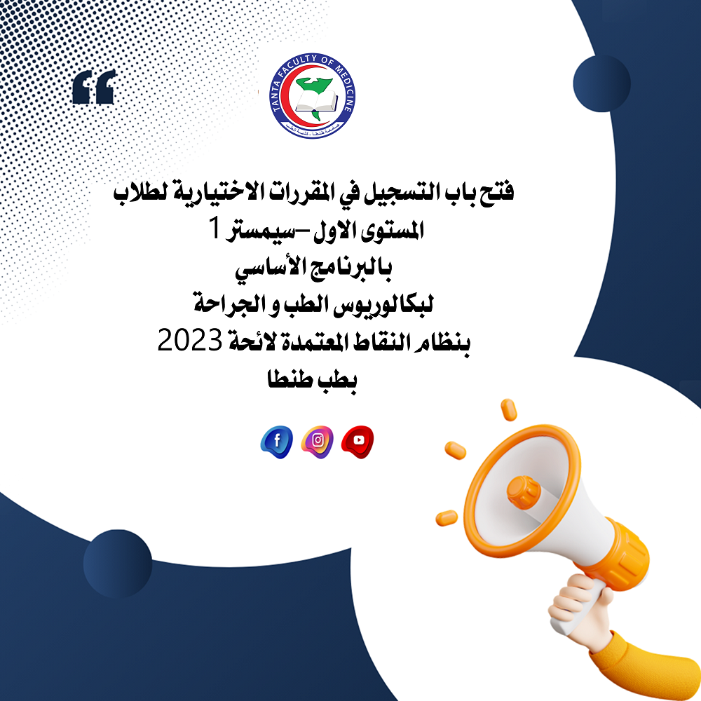 تعلن كلية الطب جامعة طنطا عن فتح باب التسجيل في المقررات الاختيارية لطلاب المستوى الاول –سيمستر 1 بالبرنامج الاساسى
