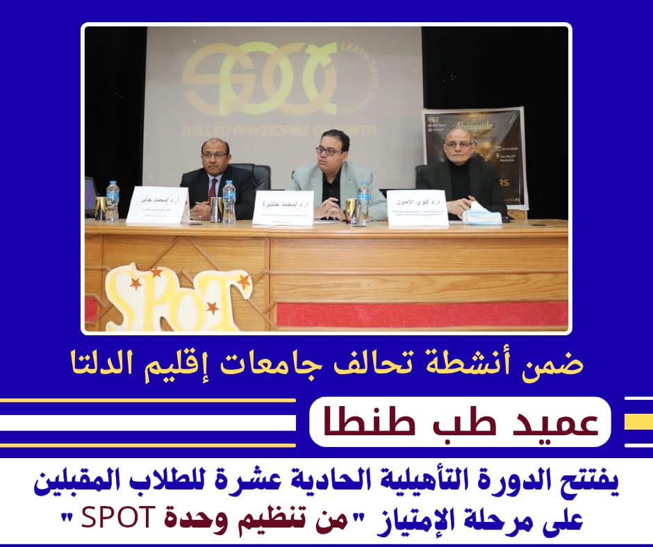 افتتح الأستاذ الدكتور محمد حنتيرة عميد كلية الطب جامعـة طنطـا ورئيس مجلس إدارة المستشفيات الجامعية الدورة التأهيلية الـ 11 لتأهيل الطلاب المقبلين على مرحلة الامتياز من تنظيم وحدة تنمية مهارات خريجي طب طنطا " SPOT " ، وذلك فى إطار الدور الريادي لكلية الطب جامعـة طنطـا وسط أقرانها من كليات تحالف جامعات إقليم الدلتا، وتقام